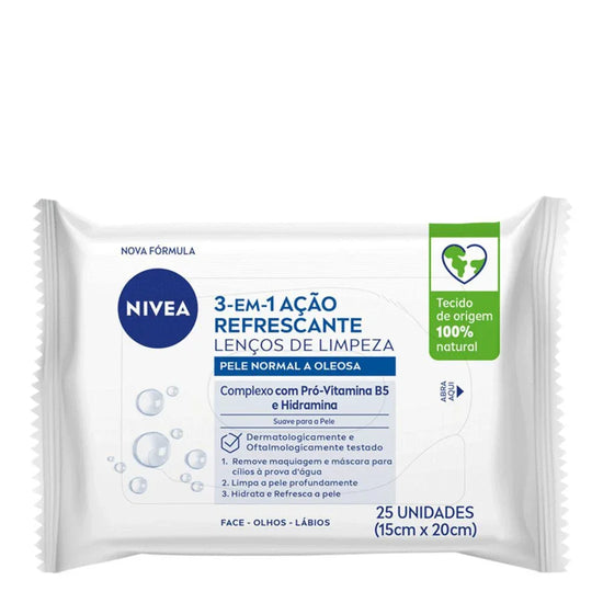 Lenço Demaquilante Nivea 3 em 1 Ação Refrescante com 25 Unidades – Limpa, Hidrata e Revitaliza